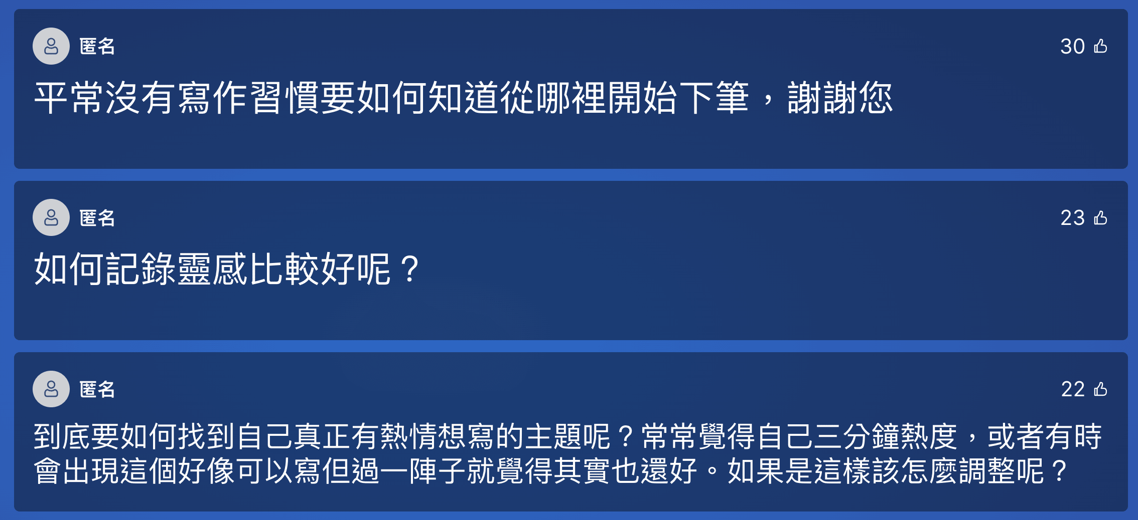 這是創作100問,每次我寫作的時候,都會打開這個大家的問題集,從問題被投票最多次的開始回答,歡迎你:
