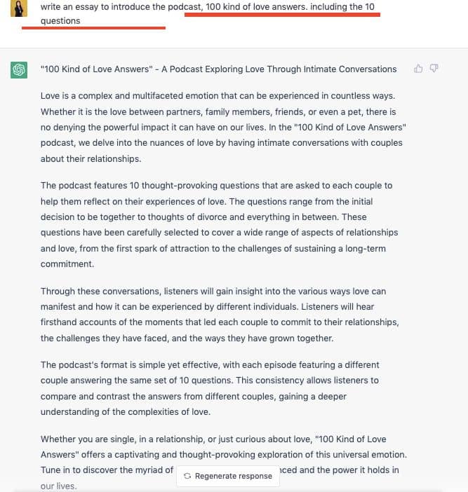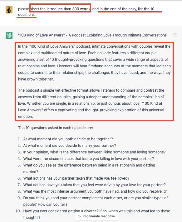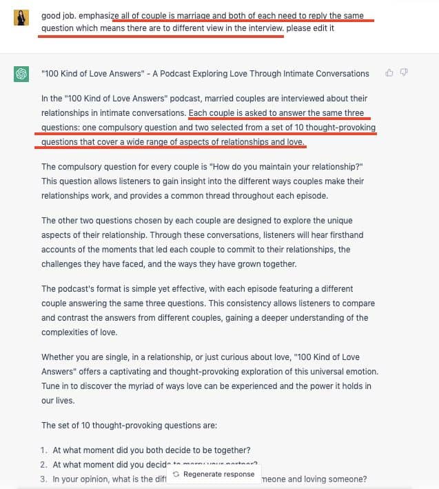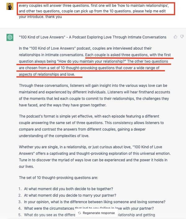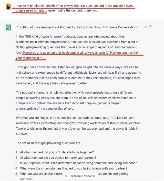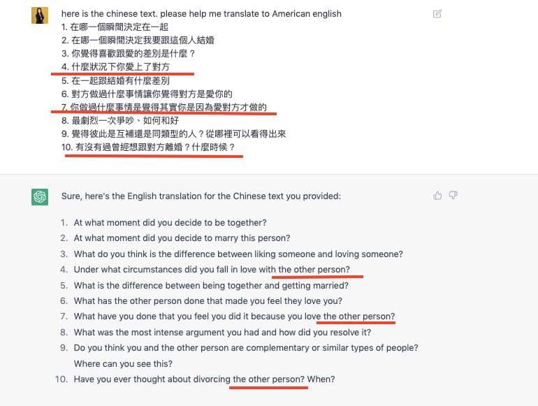 這次,我請 ChatGPT 加入,我的 podcast 會讓伴侶回覆三題,一題是「你們都如何維繫感情」,剩下兩題是從前面的 10 題中選兩題。