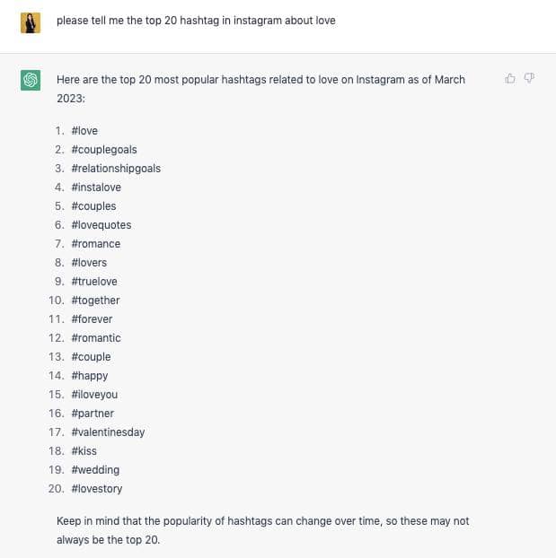 請 ChatGPT 給我關於「愛」 的 20 個 tashtag,之後你就只剩下複製貼上到 IG 了。