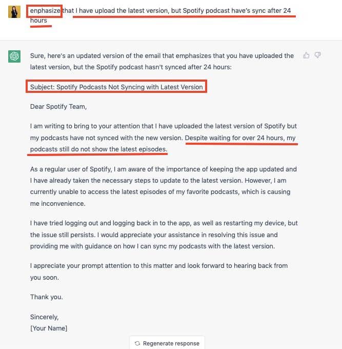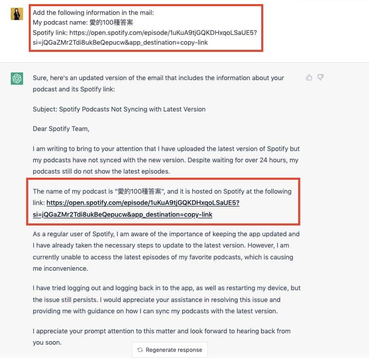 接著我請 ChatGPT 加入強調我其實已經上傳的新的檔案,但是 Spotify 沒有同步到最新的檔案。