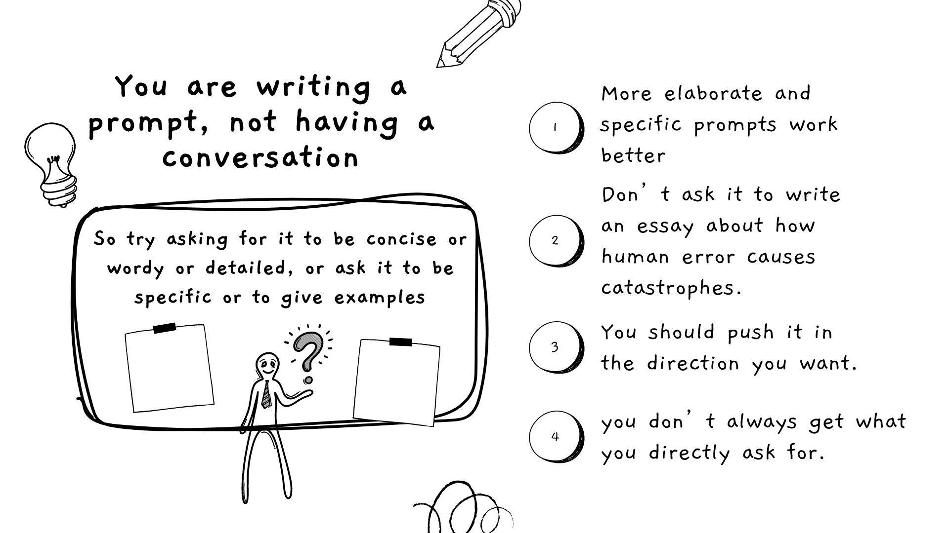 Ethan Mollick 認為,身為人類有禮貌是件非常好的事情,但我們在與 ChatGPT 對話的時候,基本上,我們並不是在對話,我們是在詠唱。因此必須要把握詠唱的原則。
