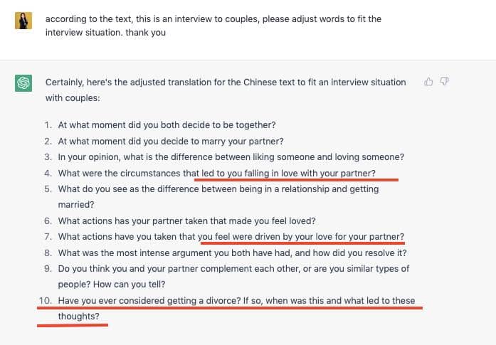 於是,我加入了更多的說明,我告訴 ChatGPT 這是一個給伴侶的訪問題目,請它再次調整。